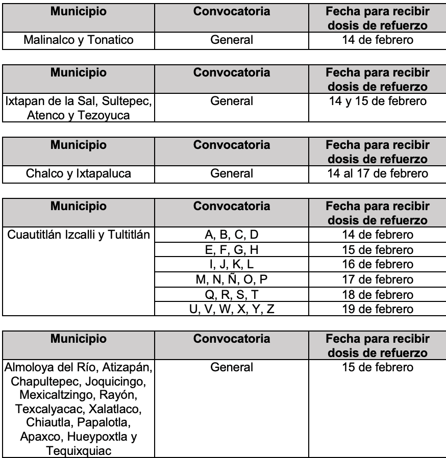 Autoridades reiteraron que pueden consultar municipios, sedes y horarios en el sitio web http://edomex.gob.mx/vacunacion. La vacuna es gratuita y segura, por lo que no es necesario pernoctar o llegar de madrugada a los módulos y, en la medida de lo posible, tratar de escalonar su arribo para no exponerse a largas filas o aglomeraciones que pongan en riesgo su salud, además de acudir desayunados y, en caso de estar en algún tratamiento, tomar puntualmente sus medicamentos.