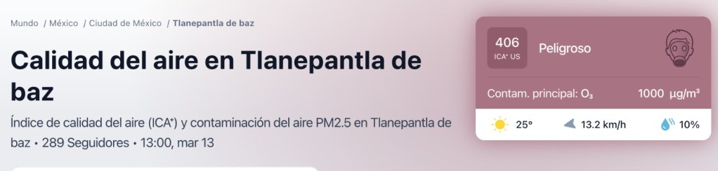 El informe de IQAir, una empresa suiza especializada en monitoreo de la contaminación atmosférica, reportó que Tlalnepantla de Baz, municipio del Estado de México, registra este jueves los niveles más altos de aire contaminado con 406 PM2.5 al 13 de marzo de 2025