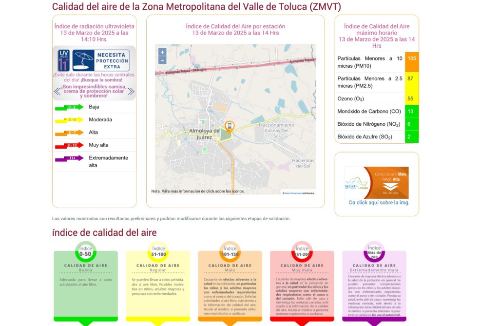 Las condiciones de la calidad del aire en el Valle de Toluca son malas, así lo informa la Red Automática de Monitoreo Atmosférico (RAMA), de la Secretaría de Medio Ambiente y Desarrollo Sostenible.