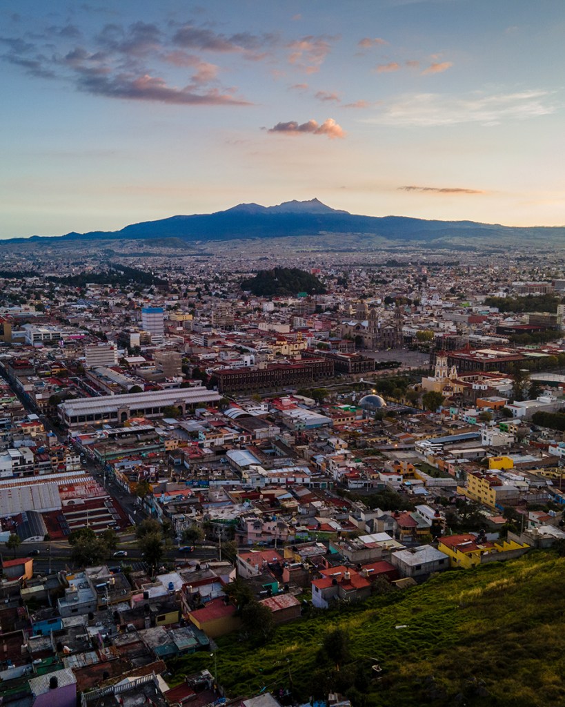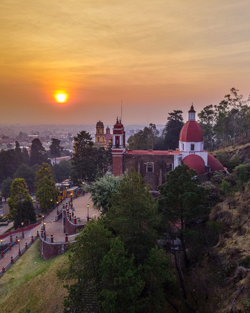 En México los cerros son sagrados, en algunos se construyeron pirámides y en otros, iglesias (como en Metepec). Al fondo el sol se asoma entre la bruma de la contaminación cotidiana.