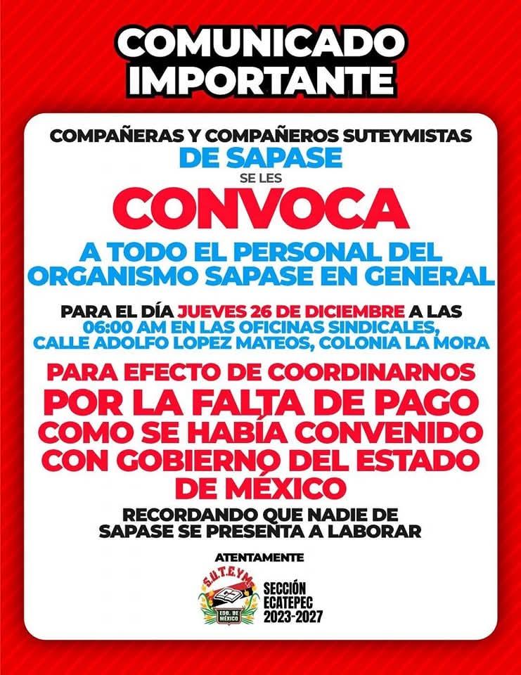 La problemática laboral no es nueva. El pasado 18 de diciembre, más de 150 trabajadores de la sección Ecatepec del Suteym bloquearon avenidas principales en el Valle de México y Toluca, incluyendo Tollocan y Lerdo de Tejada, frente al Palacio de Gobierno del Edomex. Estos bloqueos se prolongaron por más de 24 horas sin obtener respuesta del ayuntamiento de Ecatepec, lo que ha intensificado las acciones de protesta.