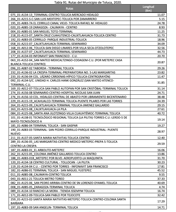 El Plan de Desarrollo Municipal de Toluca 2022-2024 expresa que la capital del Edomex cuenta con una longitud vial de 120.35 kilómetros, posicionándose en el quinto lugar a nivel nacional debido a su importancia como centro de tránsito intermunicipal.