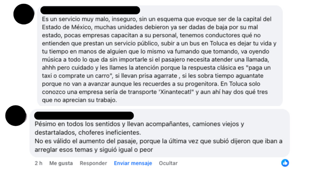 Las quejas se repiten: unidades viejas, sucias, descompuestas en plena ruta; choferes que manejan con exceso de velocidad, ponen música a todo volumen, fuman, hablan por teléfono o incluso llevan acompañantes. “Subir a un bus en Toluca es dejar tu vida y tu tiempo en manos de alguien que lo mismo va fumando que tomando”, denunció una persona encuestada.