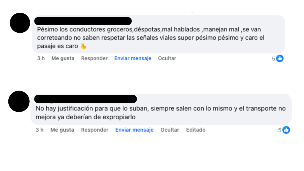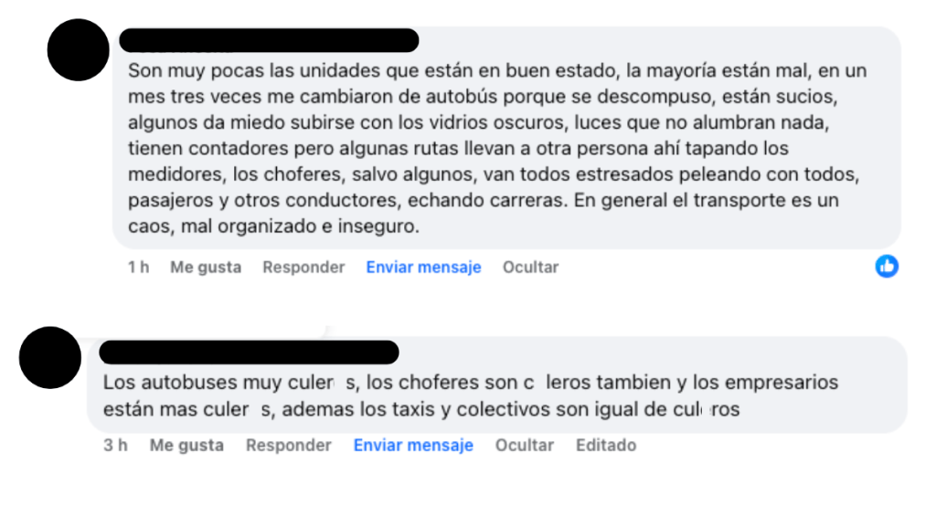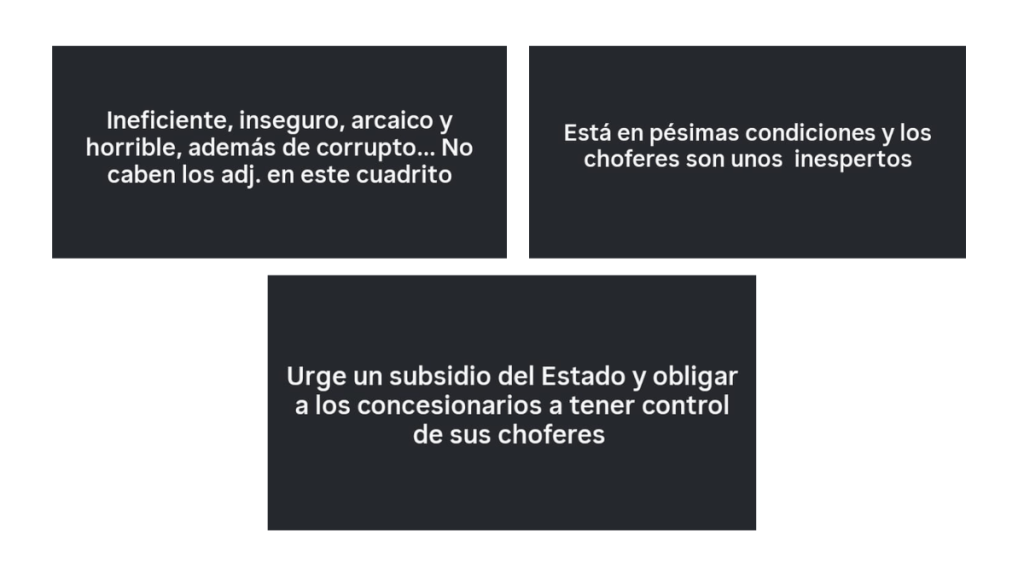 La encuesta revela el hartazgo ciudadano ante un servicio que califican de “terrible”, “fatal”, “horrible” o, en palabras de un usuario, “una porquería”. Otros reclamos apuntan a la corrupción en operativos de tránsito, la falta de sanciones a los concesionarios y la complicidad de las autoridades:
