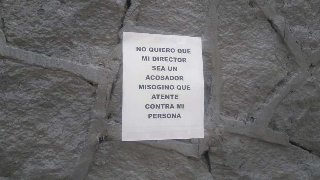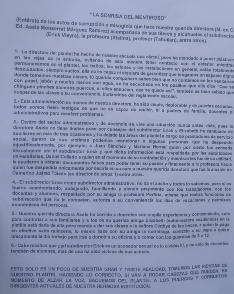 «La directora del plantel ha hecho de nuestra escuela una cárcel, pues ha mandado a poner plásticos en las rejas de la entrada, evitando que tengamos contacto con el exterior. Los baños, los salones, e instalaciones en general están totalmente descuidados, siempre sucios. Ella no es capaz de garantizar que tengamos un espacio digno con papel, jabón y menos con agua.