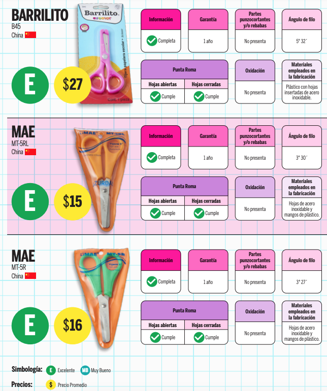 Tijeras escolares: presencia de partes punzocortantes, medición del ángulo de filo, inspección de la punta roma y oxidación.