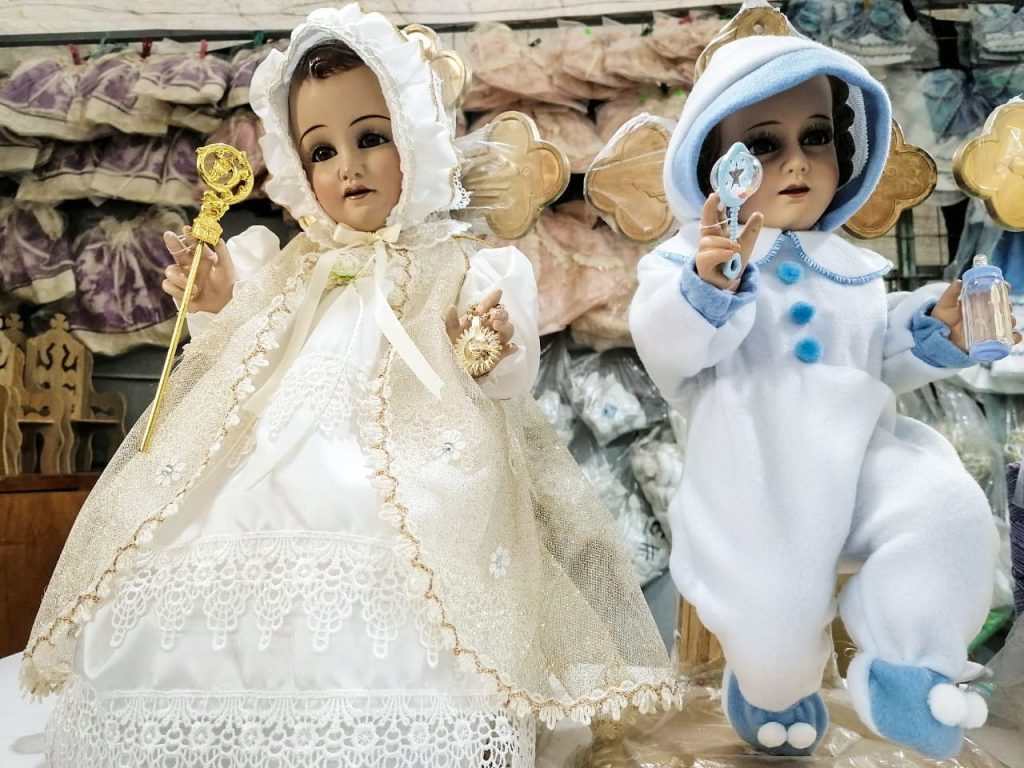 “Este año no es el mismo, nuestras ventas están muy bajas. El covid-19 nos alcanzó también a nosotros”, comenta Andrea Macedo, quien desde hace siete años se dedica a vestir niños Dios. “Es muy poca gente la que viene a buscar y la poca gente que viene de hecho busca vestimentas en específico”.