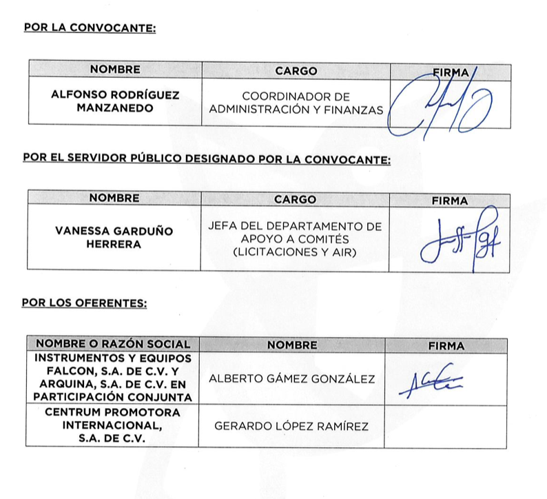 El documento fue firmado por el que entonces era el titular del Órgano Interno de Control, Victorino Barrios Dávalos; la representante de la Unidad Jurídica Consultiva y de Igualdad de Género, Rosa Flores Rojas; la representante de la Dirección de Gestión y Control, Marisol Villagrán Hernández, y los representantes legales de las empresas participantes.