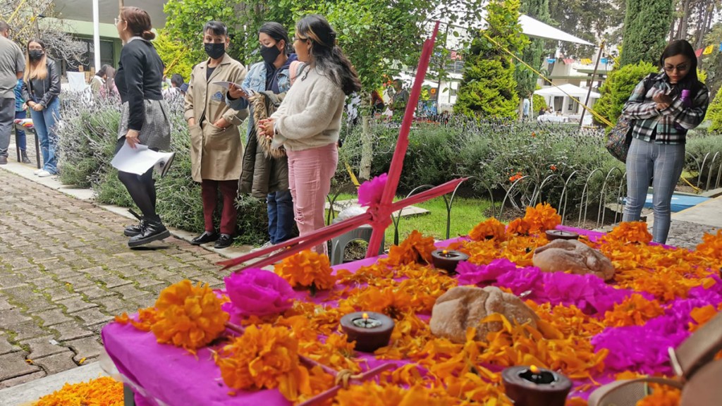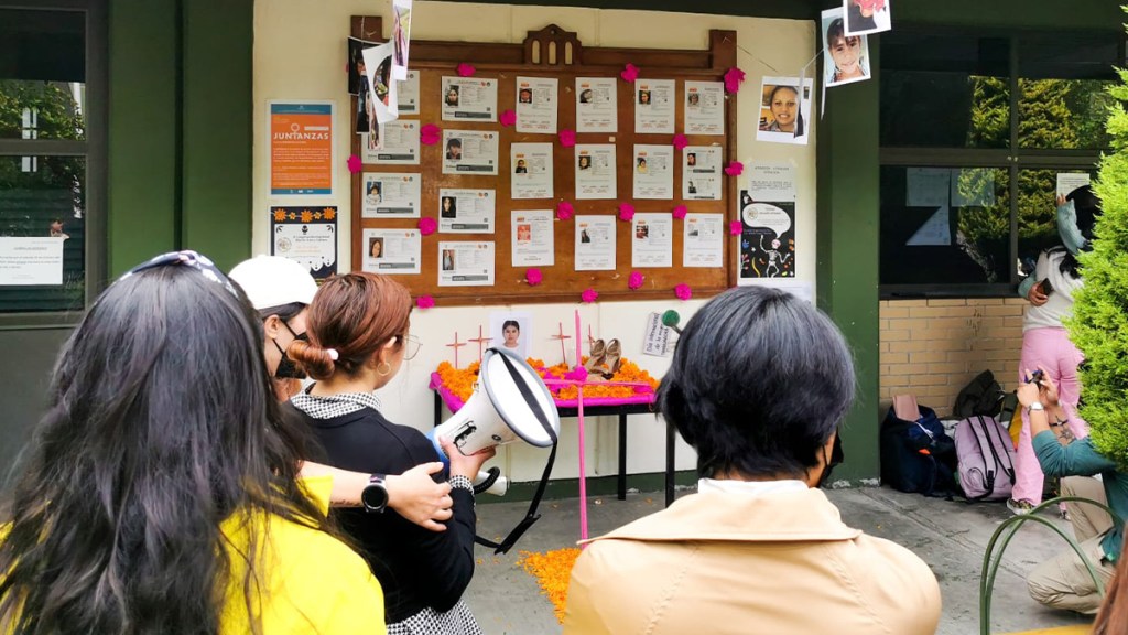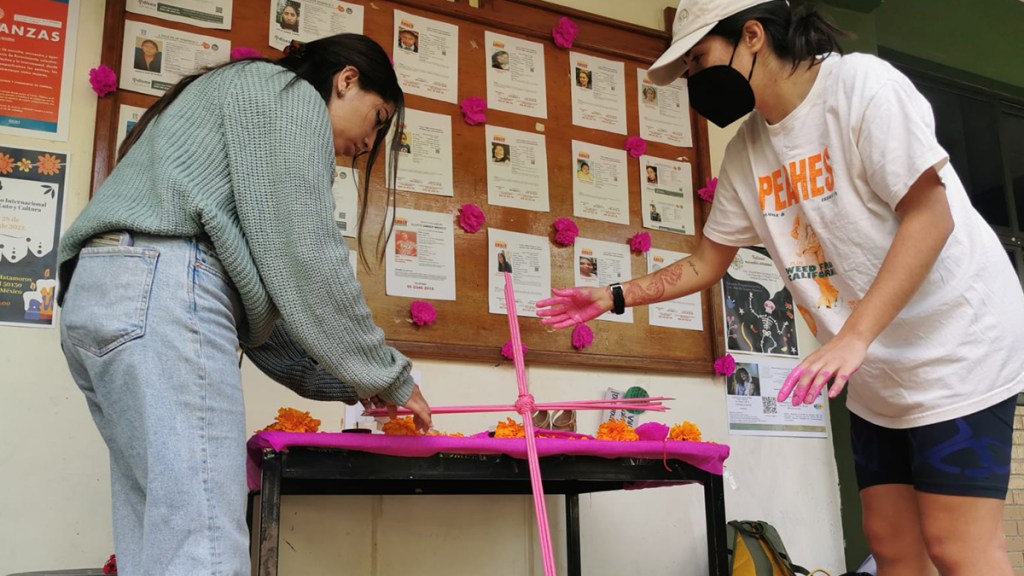 «Nosotros colocamos una antiofrenda que a diferencia de celebrar la llegada de los difuntos y celebrar la muerte, una antiofrenda es una manera de protestar y exigir justicia (…). Muchos de los feminicidios siguen impunes y los feminicidas libres», explicó en entrevista Victoria, estudiante de la facultad que participó en la actividad.