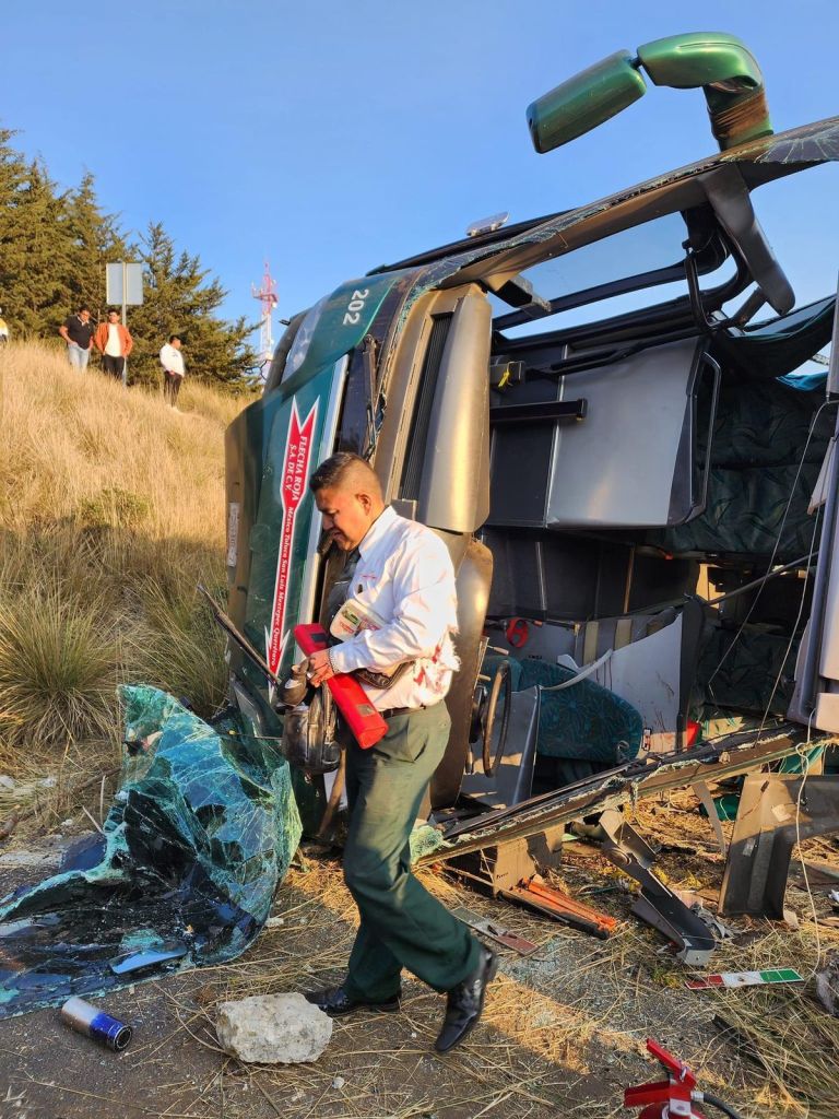 Un autobús de pasajeros de la línea Flecha Roja volcó sobre la carretera México-Toluca, a la altura de La Marquesa, en Ocoyoacac, este jueves. Se reportan 3 personas sin signos vitales y al menos 30 lesionadas.