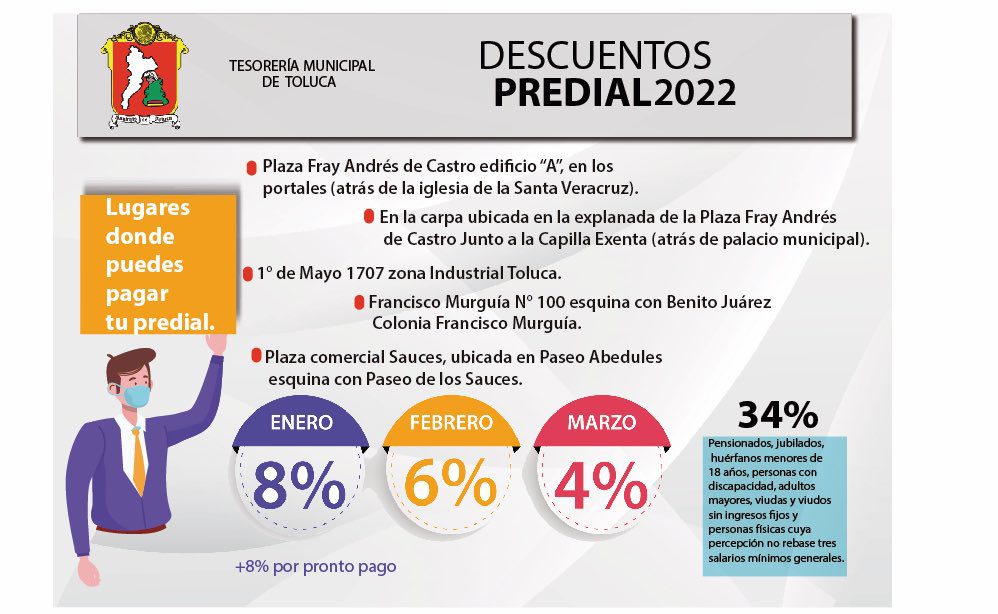 El Ayuntamiento de Toluca aprobó descuentos para los ciudadanos que paguen sus contribuciones durante los tres primeros meses del año, esto con el objetivo de aumentar la recaudación municipal. Como cada año, los ciudadanos deben cumplir con el pago de predial y servicio de agua potable.